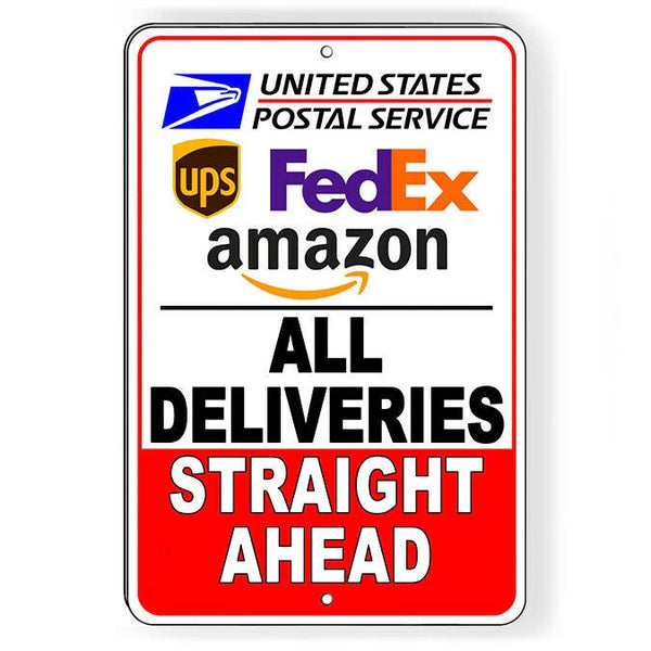 All Deliveries Straight Ahead Metal Sign